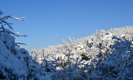 We continued to climb and twist and turn, the view opening up over the white valleys of the French Riviera on one side, the other side stretching for miles towards the distant piercing-white of the Southern Alps busy catching some rays. The views were paused in their tracks as we slowly ambled through the darkened tunnels of trees, hooded heavily with snow and silence.