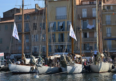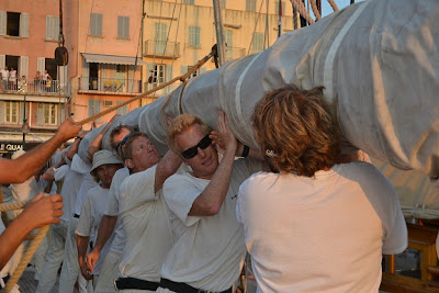 As the days begin to shorten here in the South of France, the boat is being stripped down to her winter coat. Sails have been washed and scrubbed, hung out to dry and are now in storage. Blocks have been de-rigged, the coins, sheaves and forks removed, labelled and bagged up, ready for sanding.